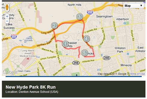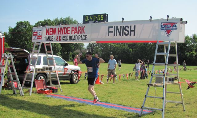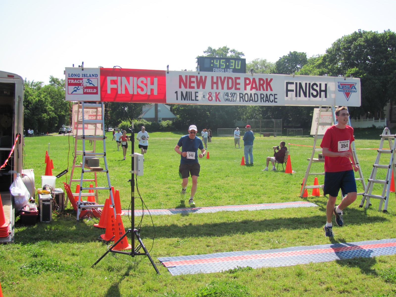 The last part of the course routes through a neighborhood leading to the field behind the Denton Ave. school. By the time I turned off Shelter Rock Road I was ready for the end and was visualizing the green field where the finish line is located. I wasn’t struggling by the last mile, but I knew that this race would not go down as a great performance. I was disappointed to see the clock showing 45 minutes when I finally reached the field, and crossed the line at 45:30.
