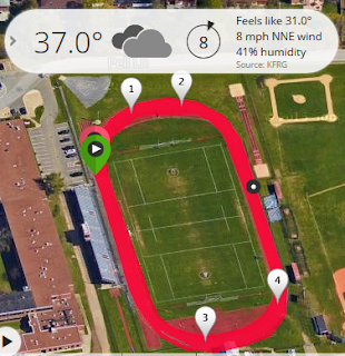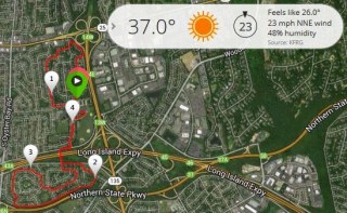 It took over five minutes to acquire a GPS signal through the overcast sky but soon I was off and running. I’d worn light track pants and a long sleeve quarter zip. That was fine until I changed direction for the first time and encountered a 19 MPH wind. Those blasts instantly brought the temperature down ten degrees. The buff helped, but my face was freezing. It was so bad that when I finally reach a point where I turned from north to east my glasses immediately fogged up from the sudden warmth combined with 93% humidity.